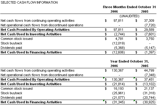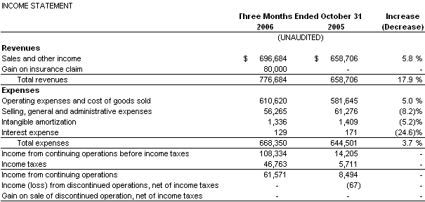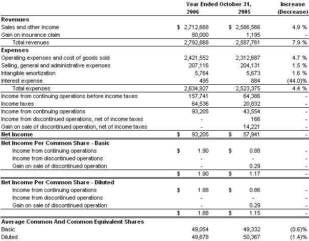 The Company reported income from continuing operations during the year ended October 31, 2006 of $93.2 million ($1.88 per diluted share) on sales and other income of $2.71 billion, compared to $43.6 million ($0.86 per diluted share) on sales and other income of $2.59 billion for last year. The increase in income from continuing operations was primarily due to the $45.1 million for the settlement of World Trade Center insurance claims and $3.6 million higher benefit from the reduction of the Company's self insurance reserves related to prioryears' insurance claims. These improvements were partially offset by $2.6 million of share-based compensation costs as a result of theadoption of Statement of Financial Accounting Standards ("SFAS") No. 123R effective November 1, 2005, and $2.0 million charge related to the outsourcing of the Company's information technology infrastructure and services in October 2006. When the Company's income from the settlement of World Trade Center insurance claims and unusual IT expenses are excluded, operating earnings for fiscal year 2006 were $50.2 million ($1.01 per diluted share), compared with $42.8 million ($0.85 per diluted share) in fiscal year 2005.