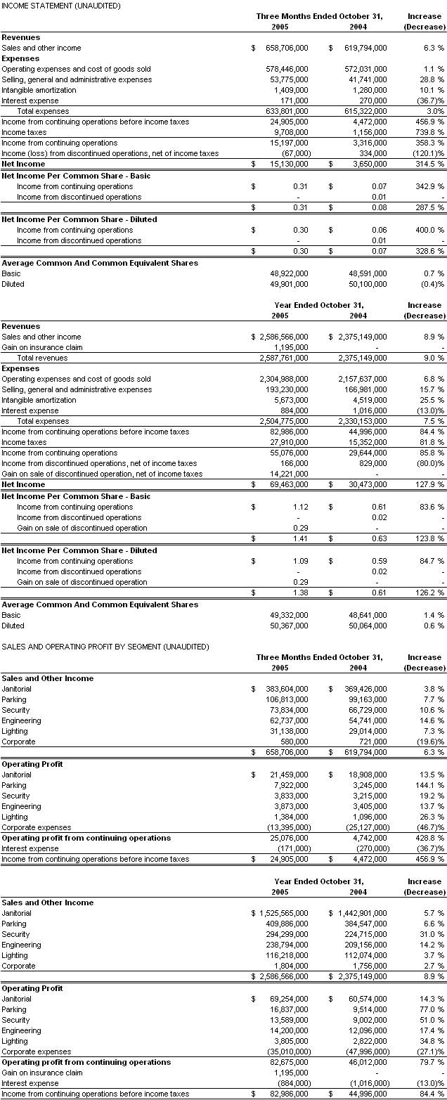 The Company's income from continuing operations for fiscal 2005 was $55.1 million ($1.09 per diluted share), up 85.8%, compared to $29.6 million ($0.59 per diluted share) for fiscal 2004. Operating results for 2005 include $5.0 million of after tax benefits ($0.10 per diluted share) from prior year insurance reserve adjustments, a $2.7 million ($0.05 per diluted share) state income tax settlement and the fourth quarter parking leasehold gain. These benefits were substantially offset by the $7.0 million after-tax ($0.14 per diluted share) increase in Sarbanes-Oxley compliance professional fees and a $3.0 million after-tax ($0.06 per diluted share) settlement of former employee litigation. Sales and other income for the year ended October 31, 2005 were $2.59 billion, up 8.9%, compared to $2.38 billion in 2004. Net income, which includes income from discontinued operations, was $69.5 million ($1.38 per diluted share), up 127.9%, compared to $30.5 million ($0.61 per diluted share) for fiscal 2004. The Company realized an after-tax gain from the sale of its Mechanical Services subsidiary of $14.2 million ($0.29 per diluted share) in fiscal 2005.