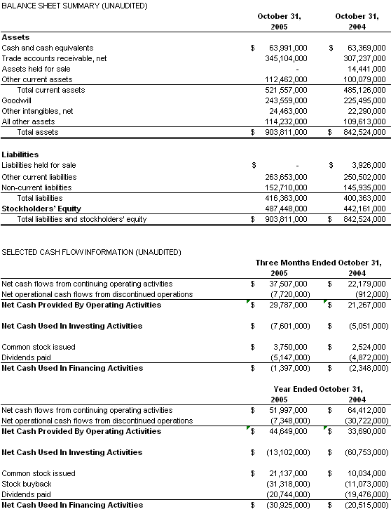 Mr. Slipsager concluded, "Given the strength of our balance sheet and our cash flow from continuing operations, we remain well positioned to continue to expand our existing lines of business in fiscal 2006 through a combination of acquisition and organic growth.