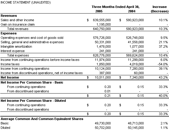 The Company's income from continuing operations during the first six months of fiscal 2005 was $18.2 million ($0.36 per diluted share), up 35.4%, compared to $13.4 million ($0.28 per diluted share) for the same period last year. Sales and other income for the six months ended April 30, 2005 were $1.28 billion, up 11.8%, compared to $1.14 billion for the comparable period last year. Net income, which includes income from discontinued operations, was $18.4 million ($0.36 per diluted share) up 34.8% compared to $13.7 million ($0.28 per diluted share) for the first half of 2004.