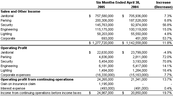 Slipsager continued, "The Company's sales grew due to contributions from acquisitions, new customers in all operating segments, and an expansion of services with existing Janitorial and Engineering customers. Our Parking, Security, Engineering and Lighting businesses posted double-digit growth in operating profits. Parking benefited from new contracts, improvement at airport locations due to increased air traffic across the country, and the termination of unprofitable contracts. Profit contributions from SSA, Sentinel, and Amguard acquisitions enabled Security to achieve year-over-year growth of 37.9% despite absorbing a pre-tax charge of $0.4 million for bad debt."