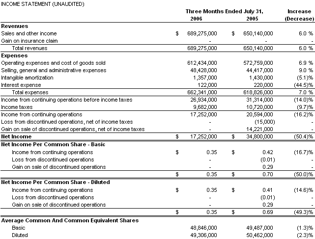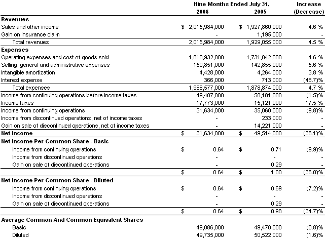The 2006 actuarial report covering substantially all of the Company’s self-insurance reserves was completed in the third quarter of 2006. The report showed favorable developments in the Company’s California workers’ compensation and general and auto liability claims, offset in part by adverse development in the Company’s workers’ compensation claims outside of California, which resulted in a $7.9 million pre-tax reduction in the Company’s self-insurance reserve in the third quarter of 2006. This reduction was $1.1 million less than the $9.0 million pre-tax reduction in self-insurance reserves recorded in the third quarter of 2005. Of the $7.9 million pre-tax benefit in 2006, $4.7 million pre-tax was recorded by Corporate while $3.2 million pre-tax was allocated to the operating segments. The Company reported income from continuing operations during the nine months ended July 31, 2006 of $31.6 million ($0.64 per diluted share) on sales and other income of $2.0 billion, compared to $35.1 million ($0.69 per diluted share) on sales and other income of $1.9 billion for the same period last year. The 9.8% year-over-year decrease in income from continuing operations was primarily due to the $2.6 million pre-tax of share-based compensation costs as a result of the adoption of SFAS 123R, and $2.4 million pre-tax of professional fees for the Audit Committee’s independent investigation of the prior year accounting at SSA. Income from continuing operations in 2005 included a $5.0 million pre-tax litigation loss and a $3.4 million pre-tax charge for the amount the Company believes it overpaid SSA LLC, which reserve was reduced by $1.0 million pre-tax in the third quarter of 2006. Also included in 2005 was $2.7 million of income tax benefit resulting from a state tax audit settlement and $1.2 million pre-tax gain on the World Trade Center indemnity payment.