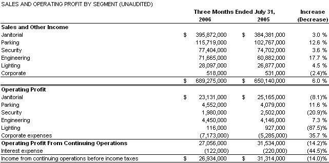 ABM Industries Announces Third Quarter Fiscal 2006 Financial Results