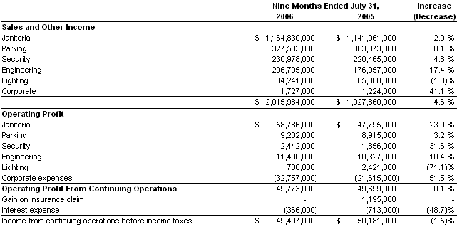 There were two items that specifically impacted the quarterly comparison for janitorial operations. The third quarter of fiscal 2006 included one more work day than the comparable period in fiscal 2005, unfavorably impacting janitorial fixed-price contracts by approximately $2.4 million pre-tax. In addition, a gender discrimination lawsuit was settled in the third quarter of 2005 for an amount lower than accrued, which increased income from continuing operations by $1.3 million pre-tax in that quarter.