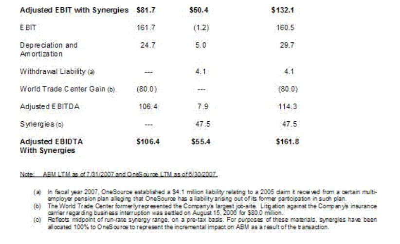 This press release contains forward-looking statements that set forth management's anticipated results based on management's plans and assumptions. Any number of factors could cause the Company's actual results to differ materially from those anticipated. These risks and uncertainties include, but are not limited to: (1) the possibility that the proposed OneSource merger may not be completed; (2) the risk that the businesses will not be integrated successfully; (3) the risk that the cost savings and synergies from the merger may not be fully realized or may take longer to realize than expected; (4) the risk that disruption from the merger may make it more difficult to maintain relationships with clients; (5) the risk that the merger may involve unexpected costs; (6) the possibility that the businesses may suffer as a result of the merger; and (7) other issues and uncertainties beyond ABM's or OneSource's control. Additional information regarding these and other risks and uncertainties ABM faces is contained in ABM's Annual Report on Form 10-K for the year ending October 31, 2006 and quarterly reports on Form 10-Q filed since such date and in other reports it files from time to time with the Securities and Exchange Commission. Neither ABM nor OneSource undertakes any obligation to publicly update forward-looking statements, whether as a result of new information, future events or otherwise.
